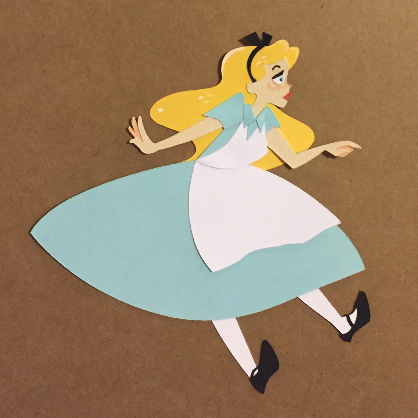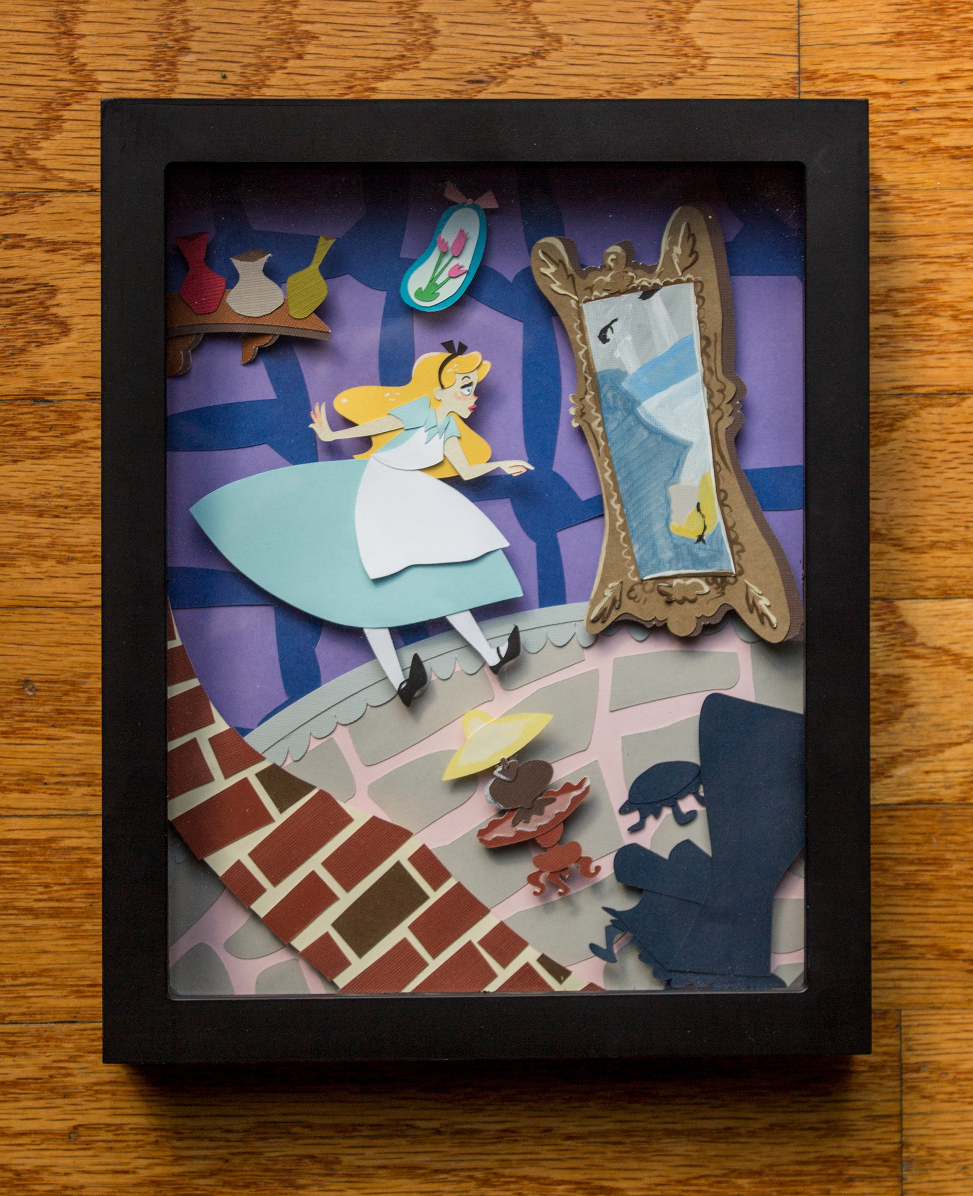 Framed, handmade 3D paper art depicting a a scene from Alice in Wonderland.