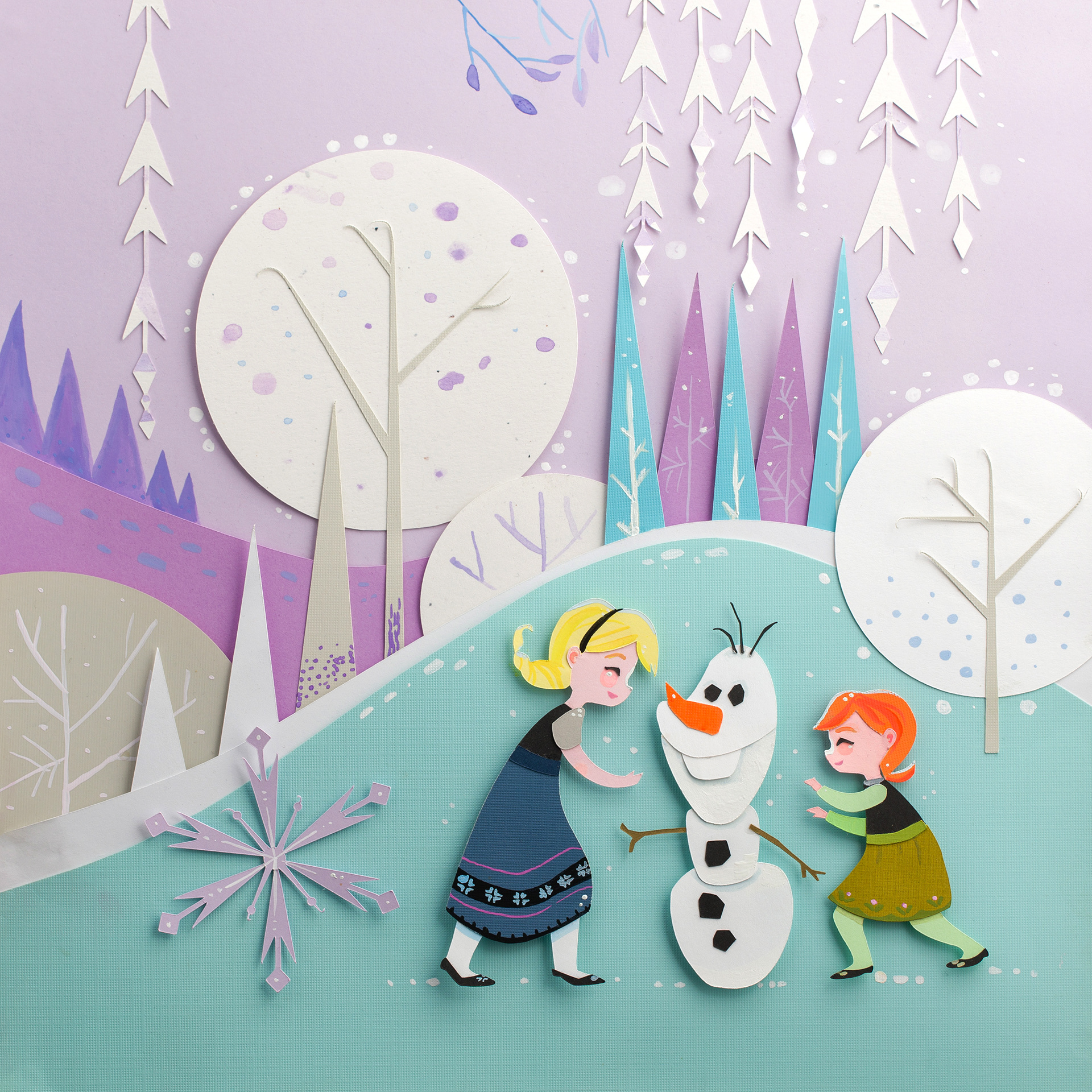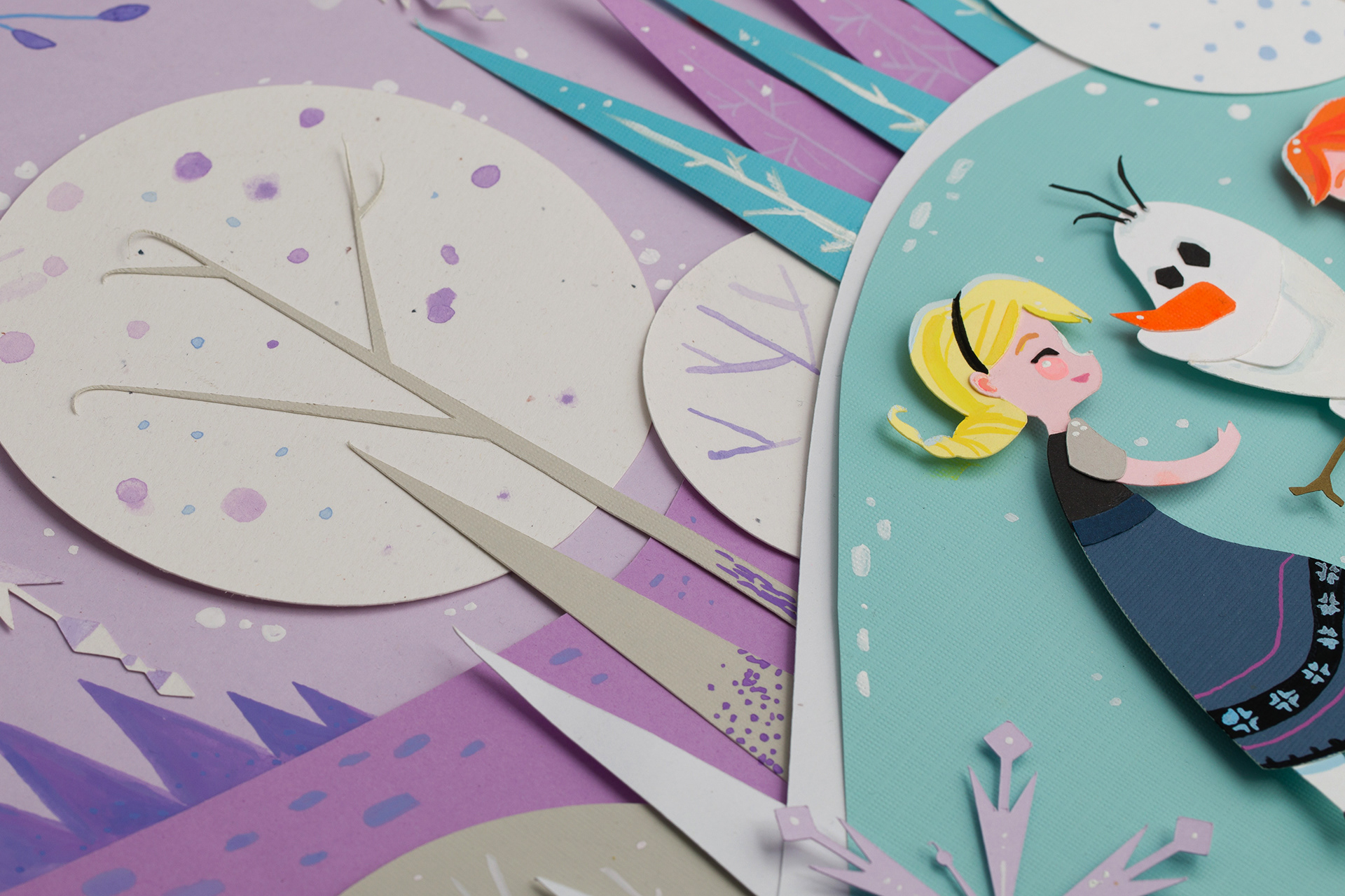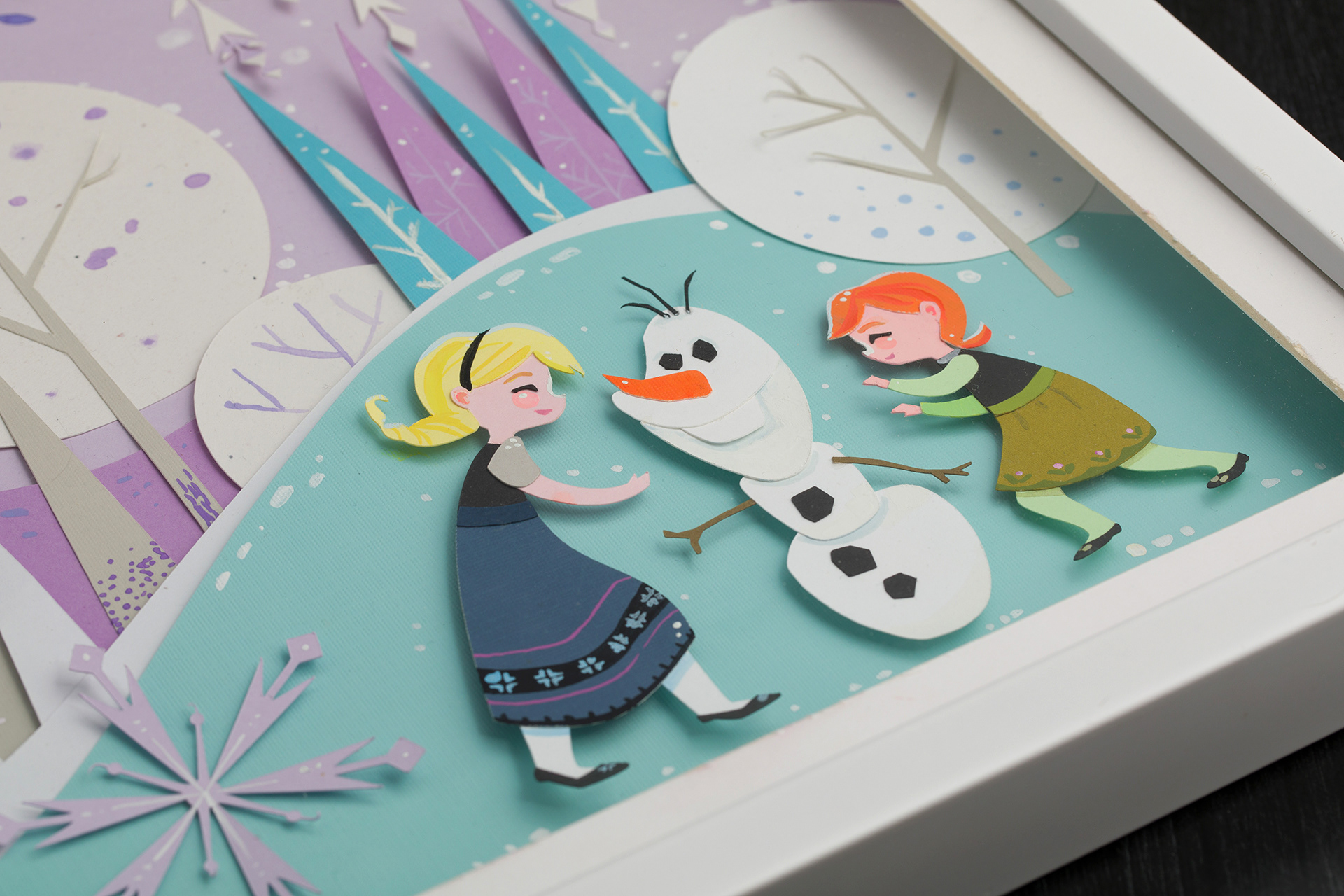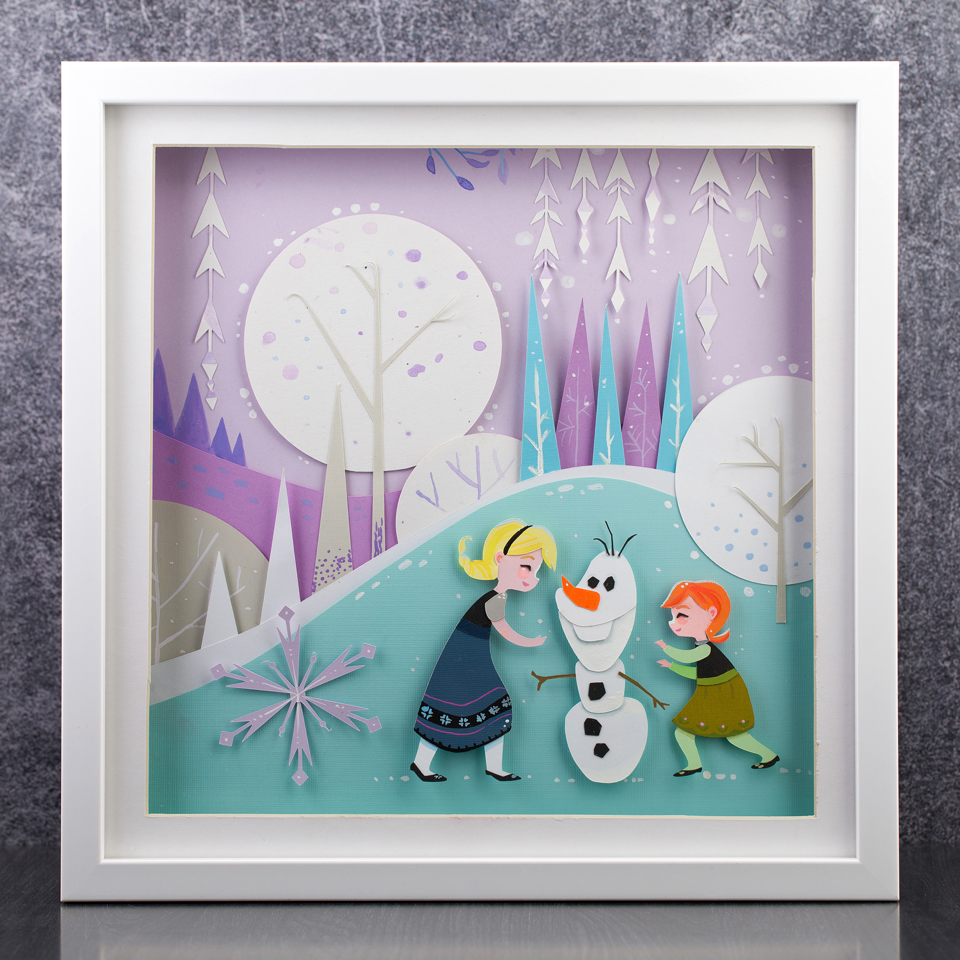Framed, handmade 3D paper art depicting a scene from Frozen.