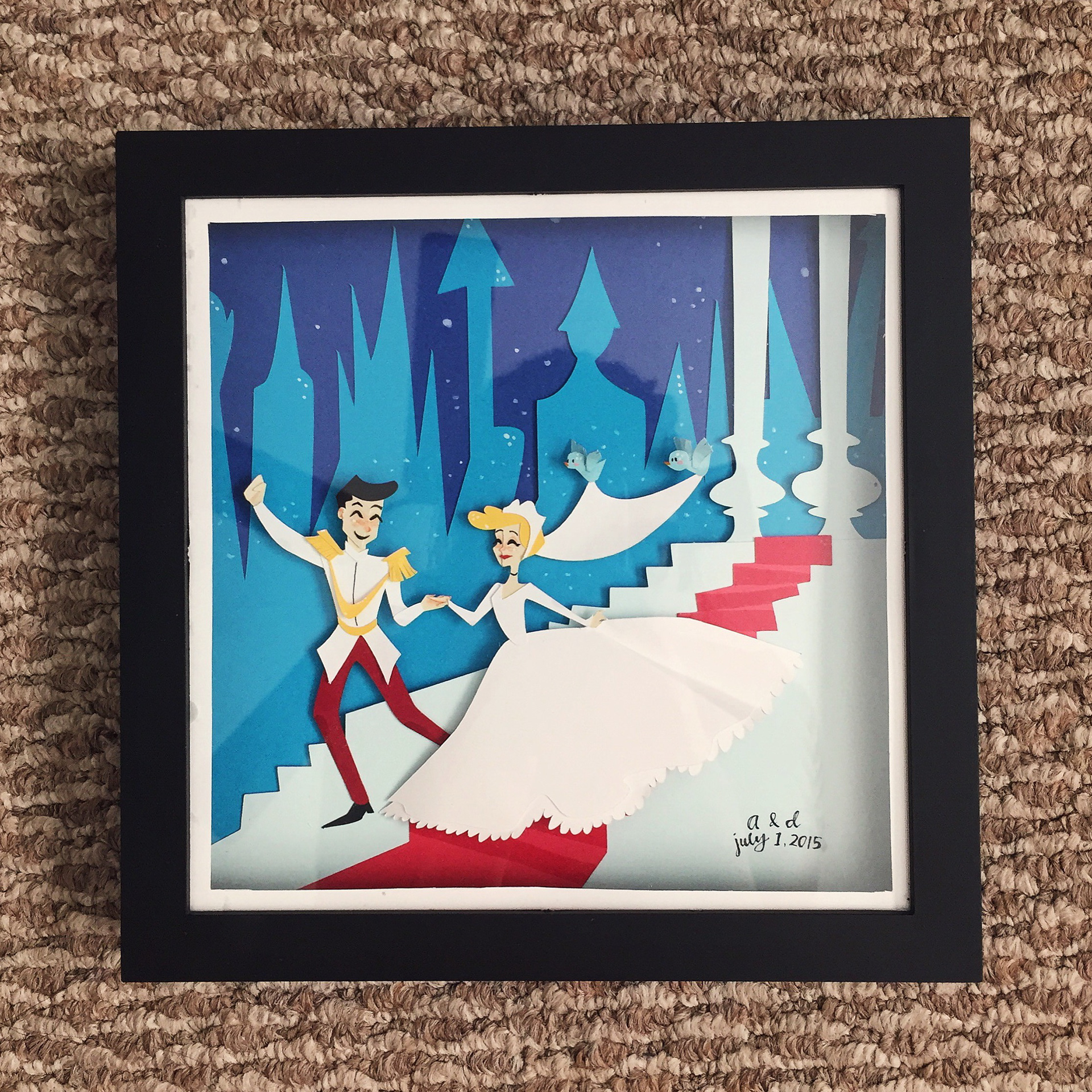 Framed, handmade 3D paper art depicting a scene from Cinderella.