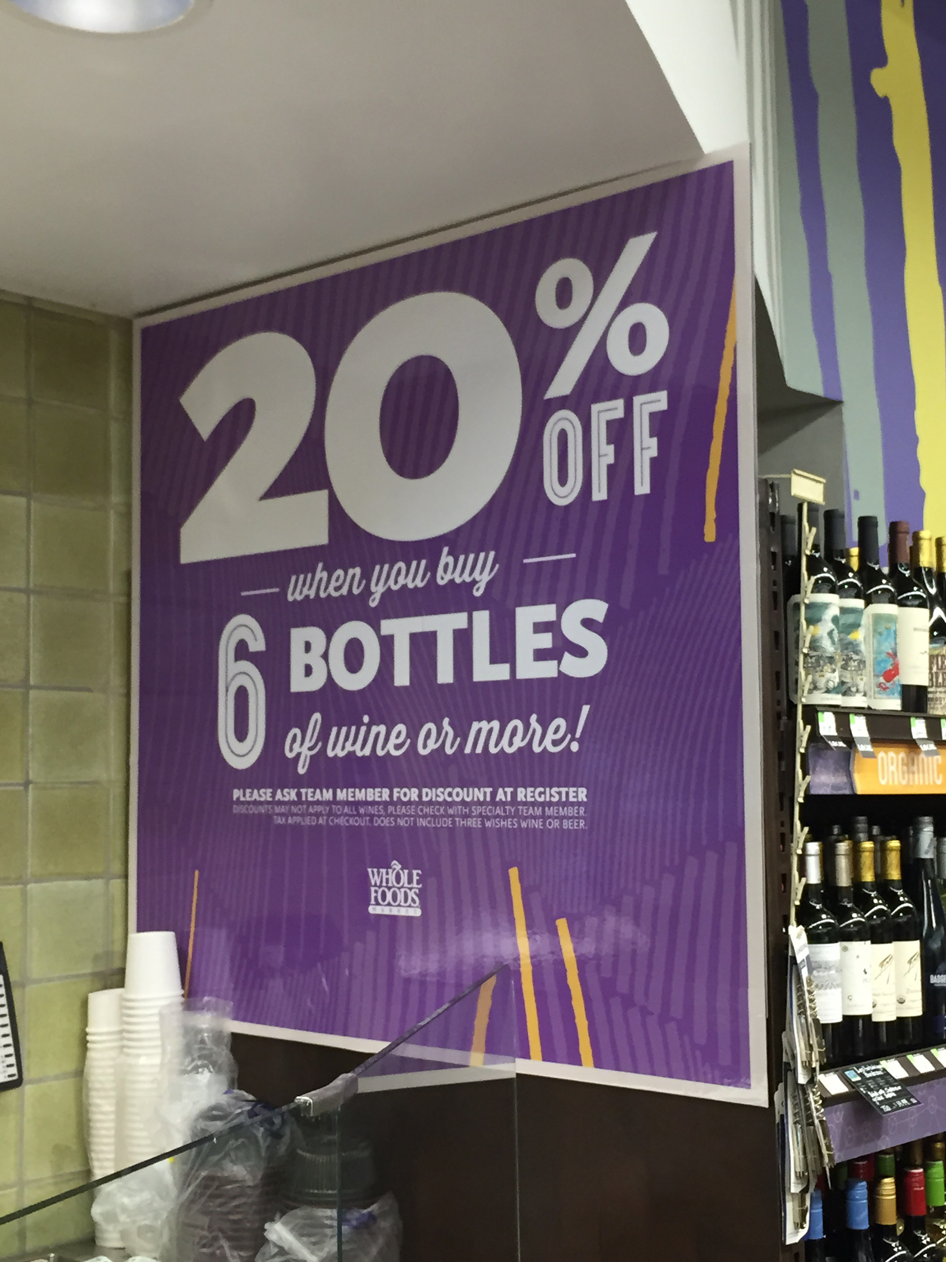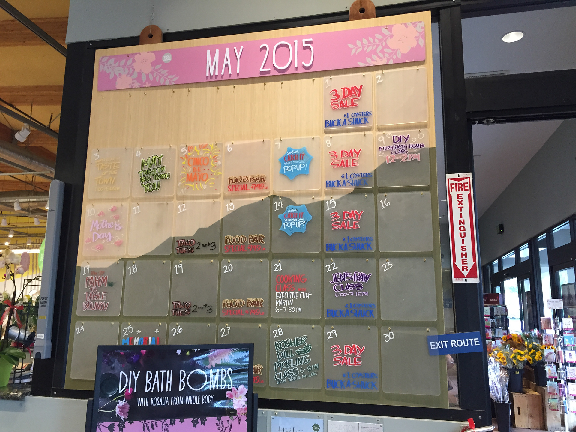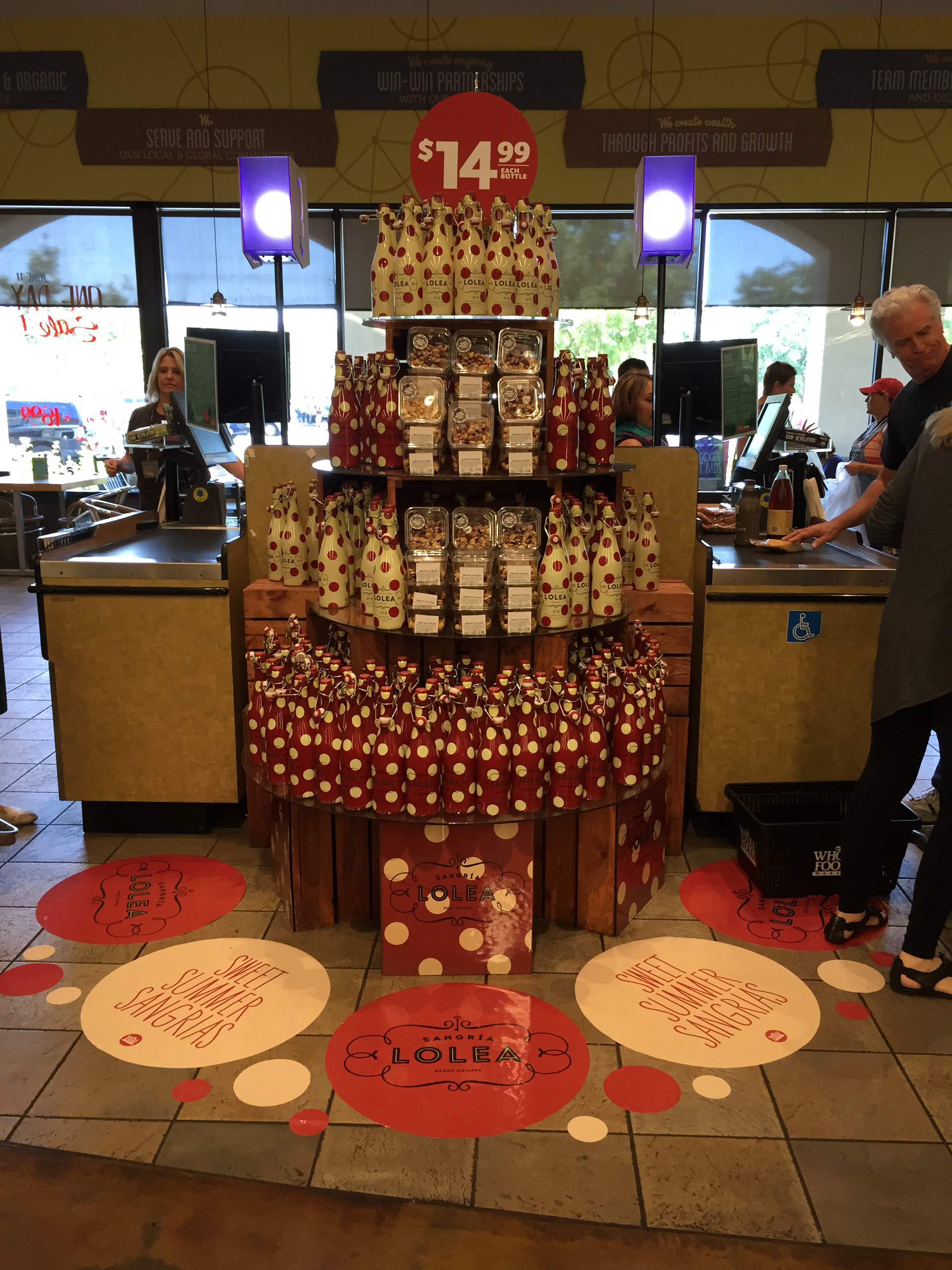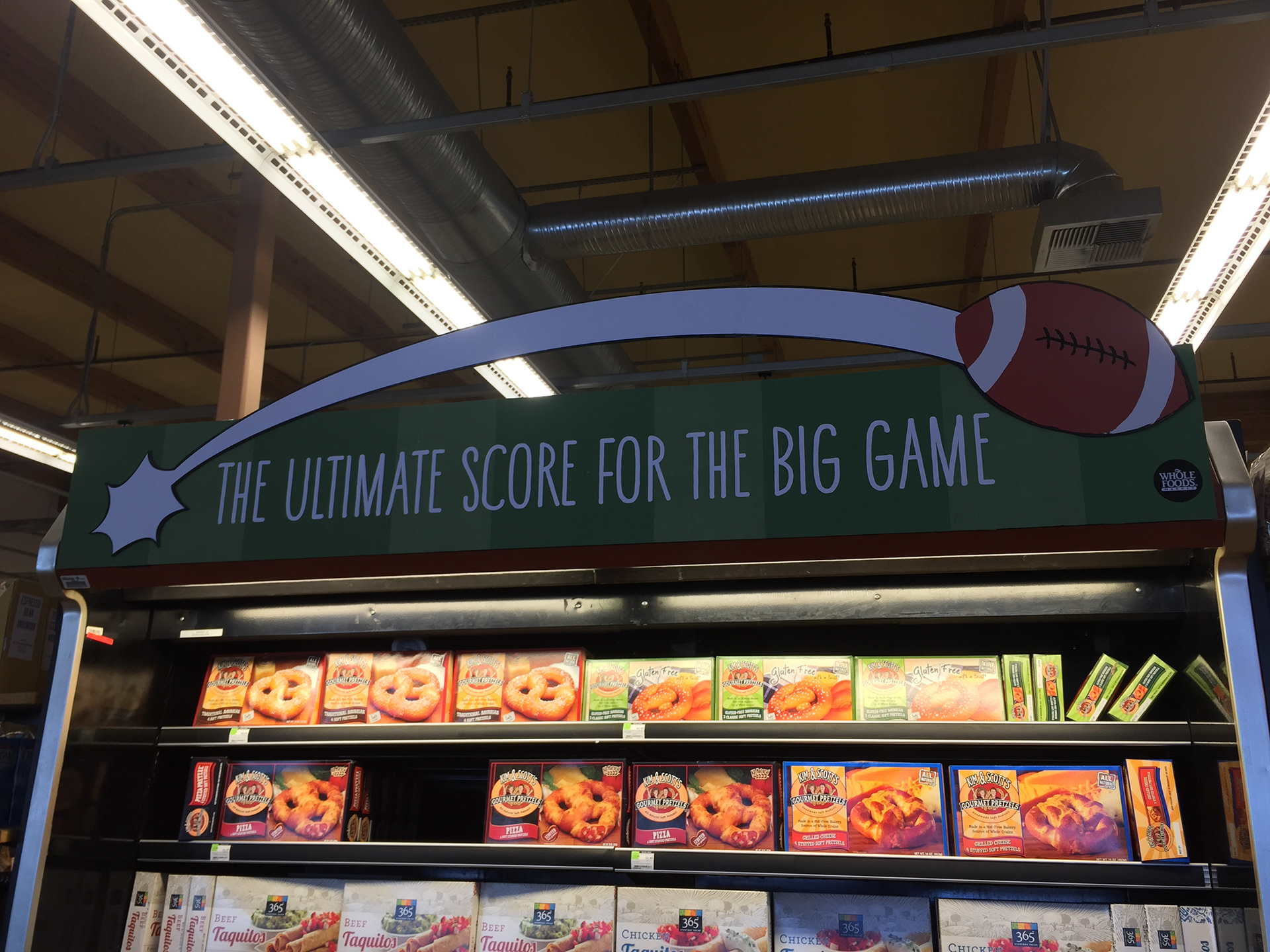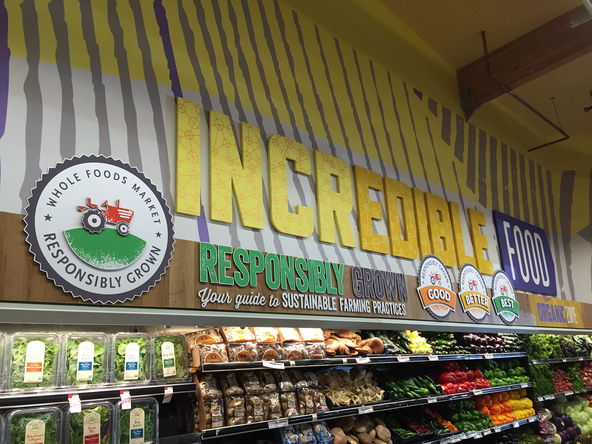 In-store signage and visual merchandising for Whole Foods Market Valencia.